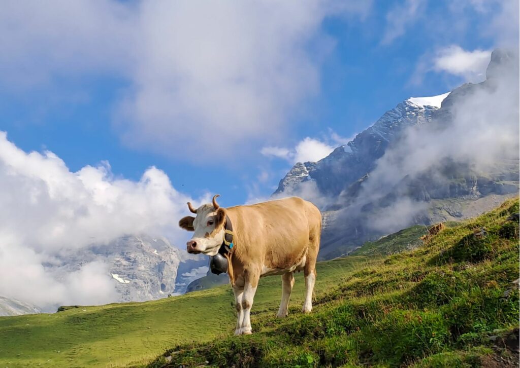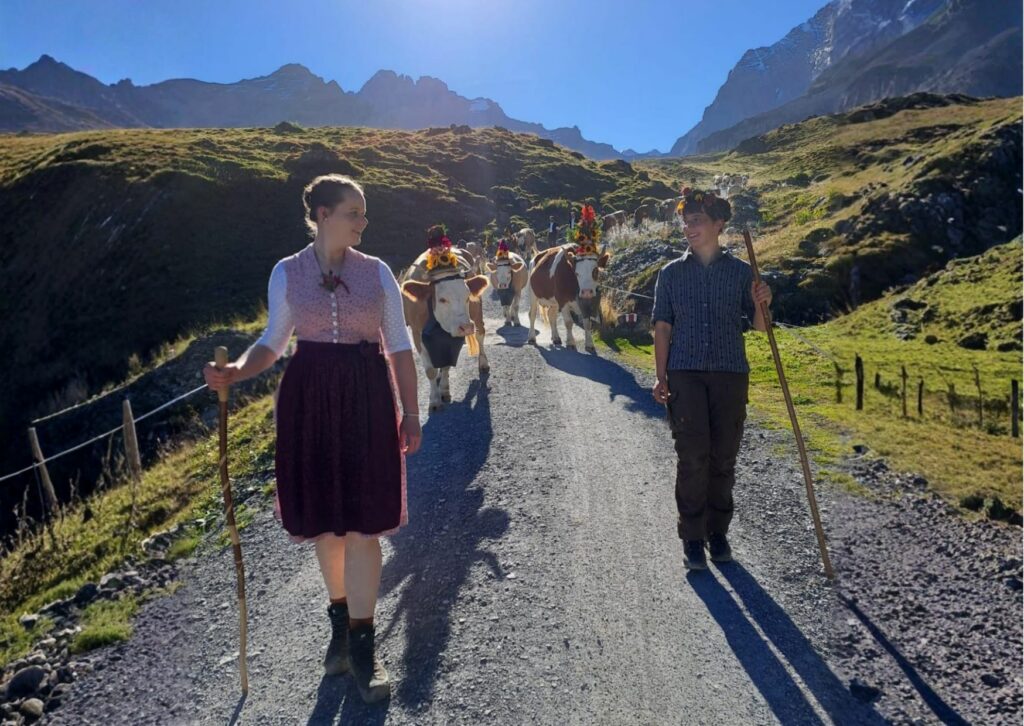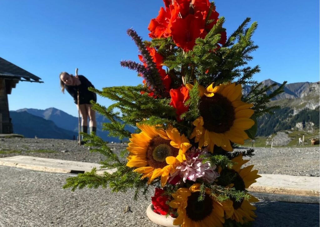 Zum krönenden Abschluss erlebe ich den Almabtrieb. Am Tag zuvor binden wir mit Hilfe der Bäuerinnen aus Naturblumen Kränze, Büschel oder Gestecke für die Kühe. Am nächsten Tag beginnt der Abtrieb früh, damit wir die Kühe rechtzeitig melken, waschen und aufbüscheln. Männer tragen Mutz, Frauen Edelweißhemd oder Tracht. Dann wandern wir etwa sechs Stunden durch die Landschaft nach Reichenbach im Kandertal, begleitet von Kuhglocken, festlicher Stimmung und dem stolzen Gefühl, den Sommer gemeistert zu haben.