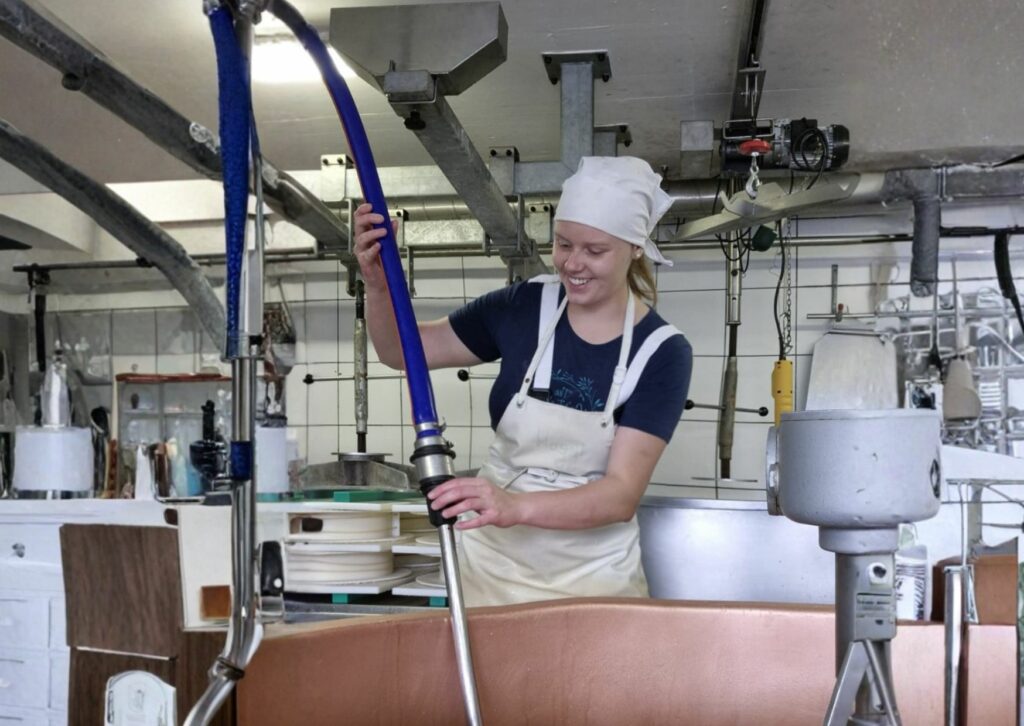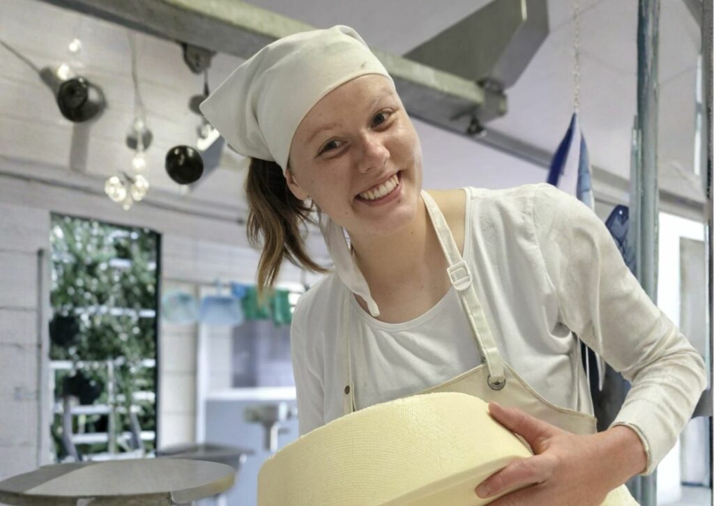 Die Arbeitstage beginnen um 4:20 Uhr und enden gegen 20:00 Uhr. Sie sind lang und anstrengend. Zu meinen Aufgaben gehört auch, die Kühe – oder Gusti – von der Weide zum Melken zu holen. Nach drei bis vier Wochen steht unser fünfköpfiges Team vor einer großen Herausforderung: Zwei Teammitglieder verlassen uns, nun sind wir nur noch zu dritt. Mehr Arbeit, mehr Zusammenhalt. Wir bekommen viel Unterstützung von Angehörigen, Bekannten und Bauern, und immer wieder gibt es Aushilfen, die ich in die Käserei einarbeiten muss – eine besondere Herausforderung für eine 19-Jährige. Doch gerade diese Aufgaben lehren mich Verantwortung zu übernehmen, auch in schwierigen Zeiten.