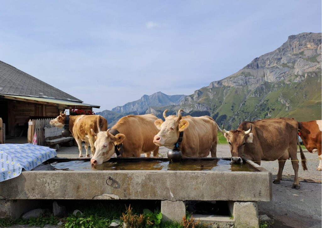 Zwei Tage bevor die eigentlichen Bewohner der Alp kommen, beziehen wir – das Alpteam – die Alp. Wir bereiten die Käserei, den Stall und das Beizli vor, sodass alles bereitsteht, sobald die Kühe eintreffen. Zwei Tage später ist es soweit: Vom Tschingelsee im Kiental bis zu unserer Alp werden die Kühe aufgetrieben. Manche der Kühe der 24 Bauern fahren mit dem Hänger auf die Alp. Für den Auftrieb und den Abtrieb tragen die Kühe größere Glocken, die in der Schweiz „Trycheln“ heißen. Auf der Alp angekommen, hängen wir die Glocken an der Hütte auf und teilen allen Kühen ihren Platz im Stall zu – das Alpsommerabenteuer beginnt offiziell.